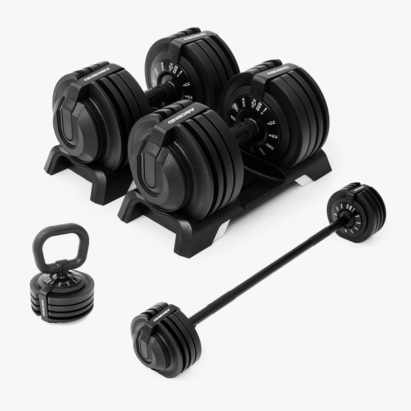 The Ascend 3-in-1 Adjustable Dumbbells replaces 12 sets of dumbbells and adjusts from 7 to 52.5 lbs. Seamlessly transform these dumbbells into a kettlebell (4lb to 27lb) or a barbell (8lb to 54lb), providing unparalleled versatility for varied workouts. The adjustable feature allows the dumbbells to be used to build or tone any muscle group. The easy adjustments allow you to change the weight as you transition through various exercises. The Ascend Adjustable Dumbbells comes fully assembled with a storing base, ready for action right out of the box, putting your focus where it matters – on your fitness goals.