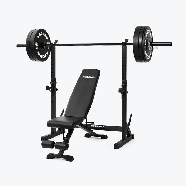 - Ascend Squat Rack with metal bar holders for bench pressing